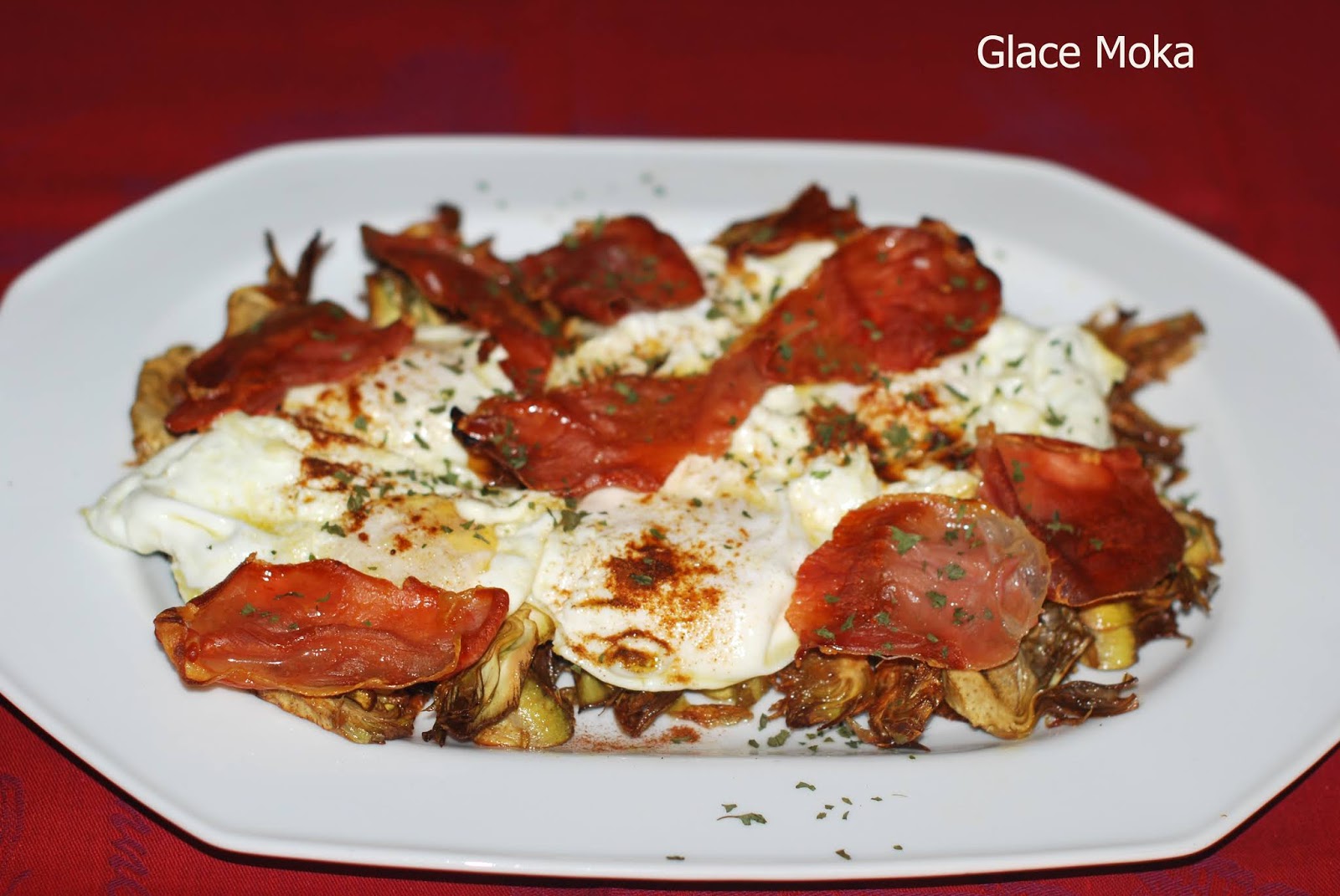 HUEVOS ROTOS CON CHIPS DE ALCACHOFAS Y CRUJIENTE DE JAMÓN